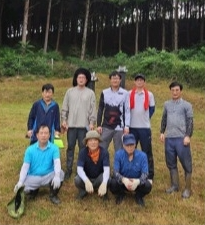 벌초후 묘전에 선 후손들<윗줄 왼쪽부터 보선, 현진, 경진, 형진(이상 고손), 재봉/ 아랫줄 왼쪽부터 재구, 재덕, 재헌(이상 증손)> |